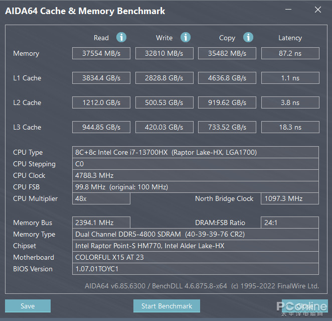 使用AIDA64中的Cache&MemoryBenchMark进行内存与缓存测试,内存在读取、写入、复制的速度分别达到了37554MB/s、32810MB/s、35482MB/s。