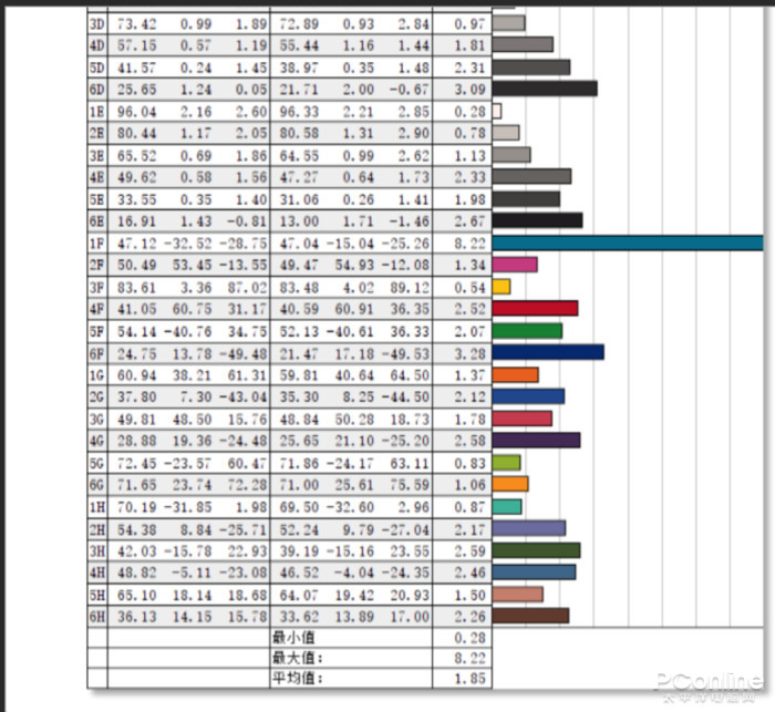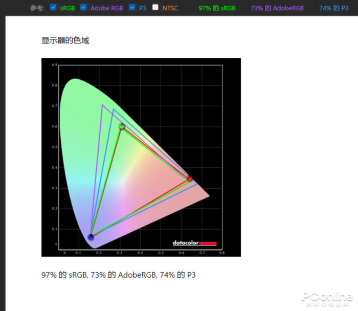 色域以及色准表现方面,通过红蜘蛛X测试,其具备97%sRGB、73%AdobeRGB、74%DCI-P3的色域覆盖;色彩准确度方面,ΔE=1.85,达到了专业显示器的水平。