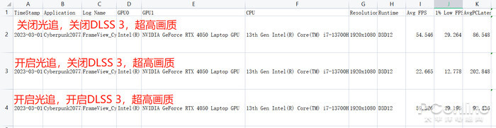 而在帧数表现上,通过FrameView帧数记录软件记录,关闭DLSS3我们仅获得了不到20的FPS,开启DLSS3后,游戏内的平均帧数几乎达到了60FPS。