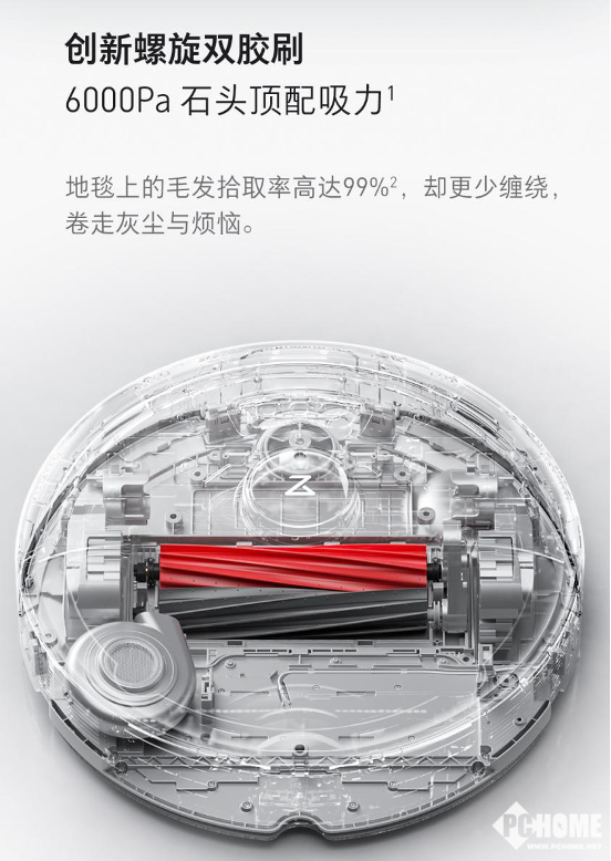 扫拖机器人漏扫、卷毛发是目前存在的普遍痛点,清扫后需要人工二次清理。石头自清洁扫拖机器人G20创新搭载的双螺旋胶刷,通过对向内卷,配合6000Pa 飓风吸力,吸铲同时进行,达到“双卷-猛吸-双铲”的效果,极大减少漏扫的可能。毛发处理效果比上代单刷更强,对地毯场景、宠物家庭场景,非常友好。同时得益于主刷的斜向螺旋设计,缠绕在刷子上的毛发都会被“运”到主刷边的储毛仓,不会影响到主刷的正常工作,避免了随时需要手动清理的尴尬。