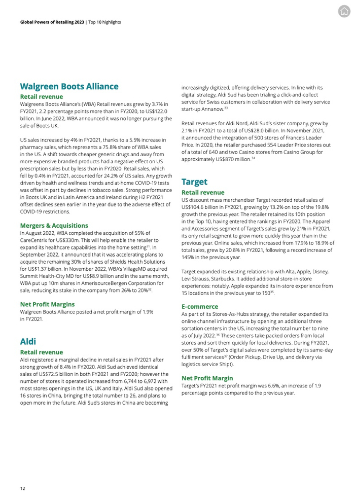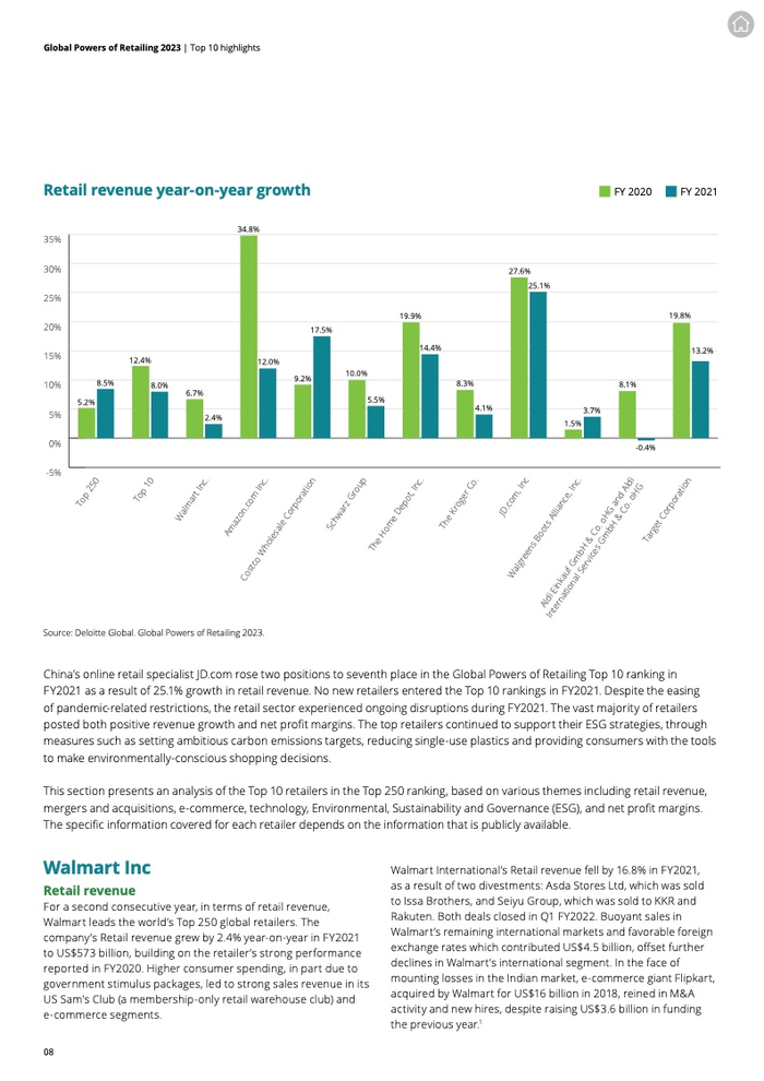 沃尔玛再次领跑全球零售商。亚马逊及其它数字零售商在新冠疫情期间和之后受益于消费者向数字购物的行为转变。京东2021财年收入增长25.1%,是增长最快的十大零售商。十大零售商中的大多数通过店内技术(如家得宝的Hdphones)或加强全渠道产品供应(如京东的“Shop Now”随需购买服务)来提高其数字化购物水平。