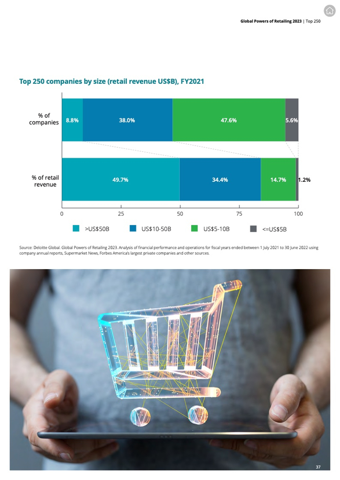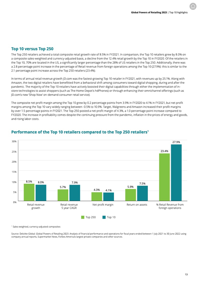 德勤全球发布了《2023全球零售力量年度报告》,报告根据2021财年(*2021年7月1日至2022年6月30日之间的财政年度)的公开数据,评选出全球250家最大的零售商,并分析了其在各地区和产品领域的表现。该报告聚焦前10名和前250名的零售商以及增长最快和新兴的零售商,展望了2023年的经济前景,剖析可持续发展的最新趋势,并对零售店的未来提出了深刻见解。