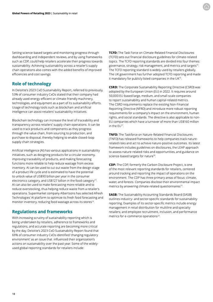 在过去几年间,可持续发展受到持续关注,消费行业73%的高层主管在过去一年里增加了对可持续发展的投资。零售商在可持续方面的工作重点正在向这四个新兴领域转移:零售转售、供应链的可持续性、技术的应用以及法规和框架。