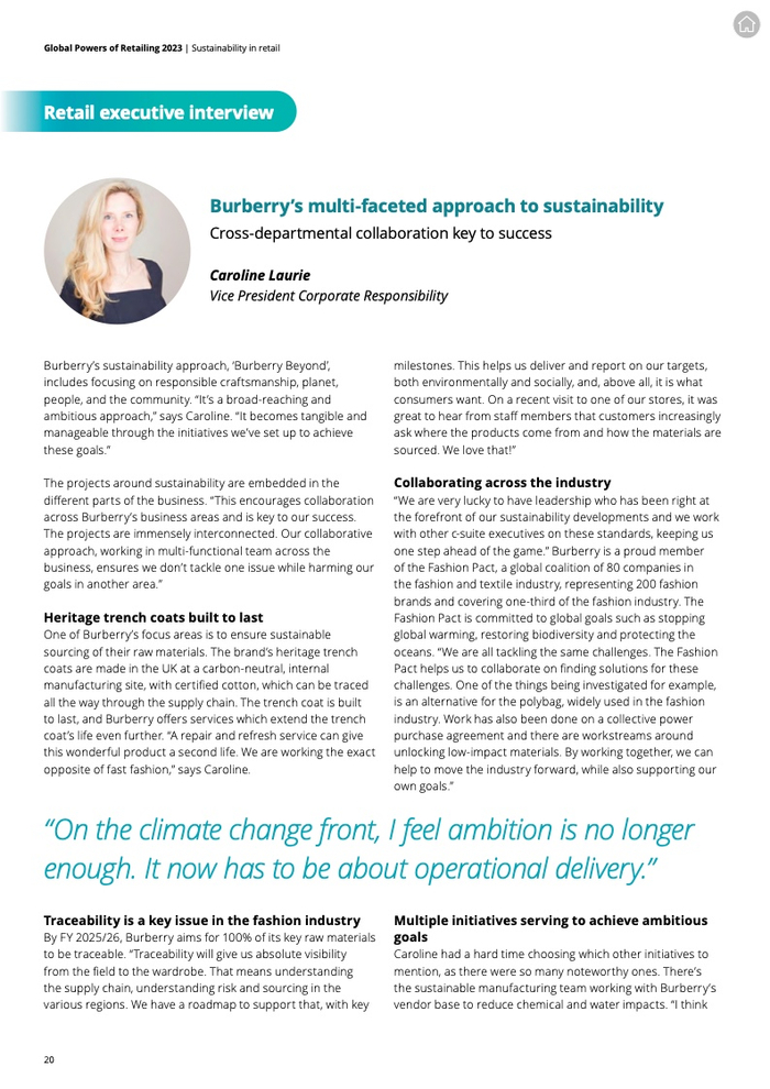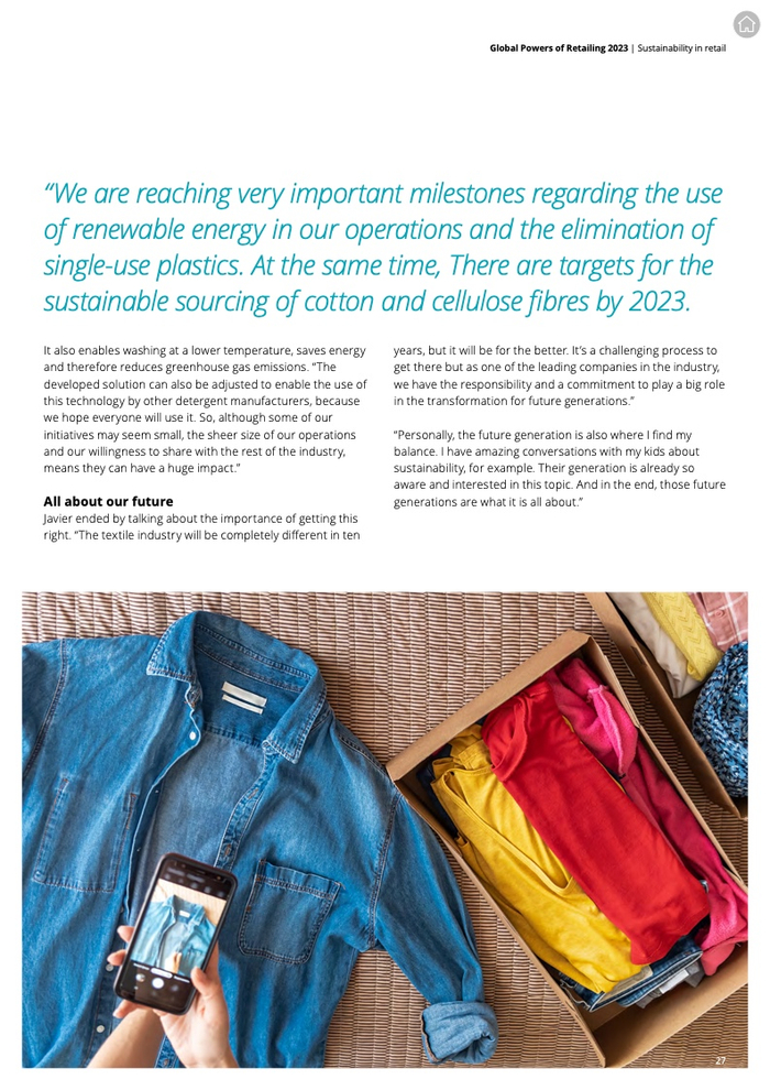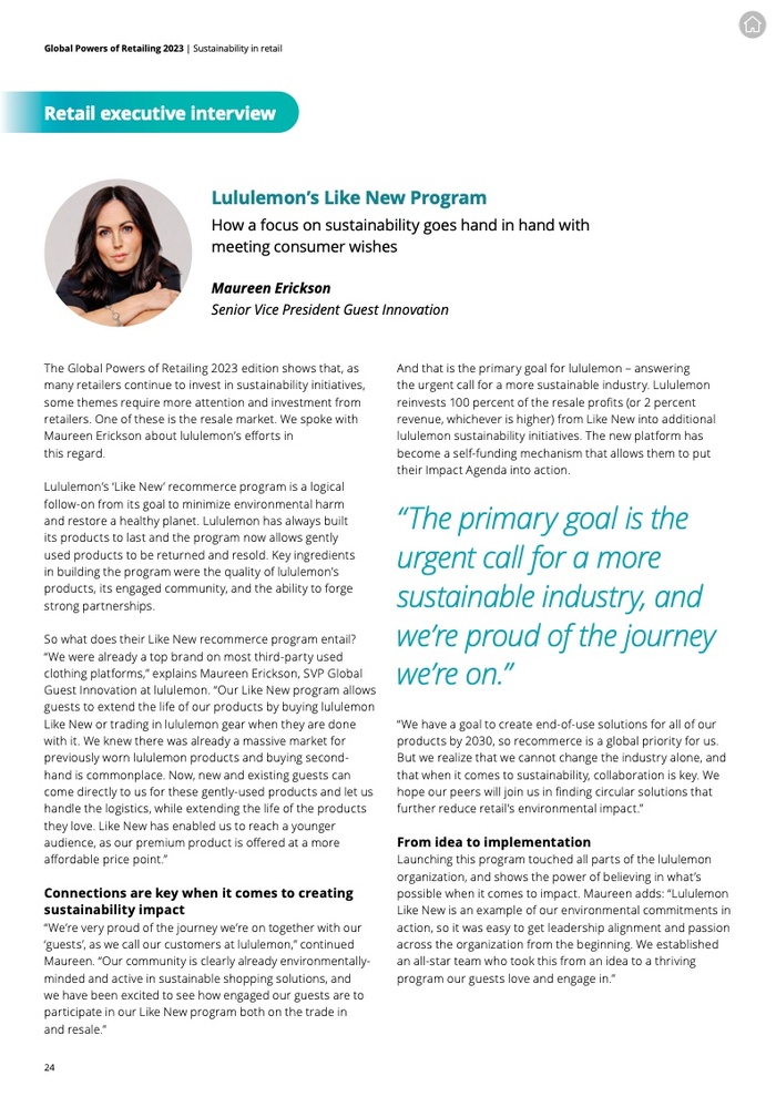 德勤全球消费者行业及可持续发展主管合伙人Leon Pieters表示:“很高兴看到很多零售公司将可持续作为企业的重要议题。我们也看到,越来越多的零售企业正开始专注于转售业务,并致力于将可持续融入他们的供应链过程。”
