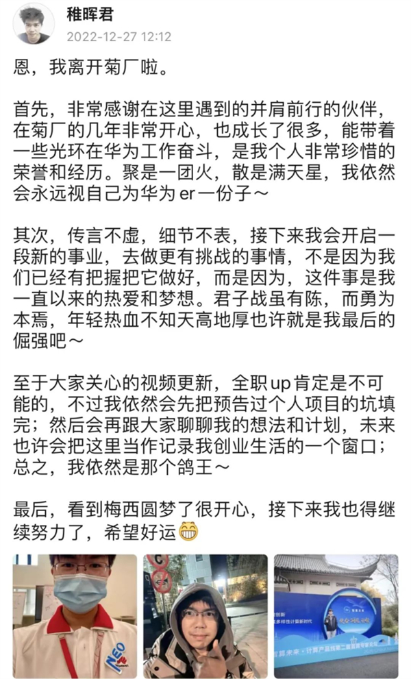 不久前从华为离开的稚晖君,入职也已超过两年,据悉其下一站创业方向是机器人,目前已获得天使轮融资,投资人还是一位行业大佬。