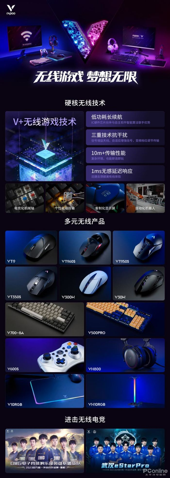 以技术研发为核心,以市场需求为指引,V+无线游戏技术提升优化续航、低延迟、抗干扰、使用距离,准确分析,果断判断和专业反应,全面升级无线电竞标杆配置。自主研发定制雷柏轴体、雷柏微动、游戏芯片等核心产品部件。热插拔轴、Qi无线充电、OLED显示屏、防水防尘、板载内存、云端存储等具有出色电竞表现的个性化功能解决玩家需求痛点。