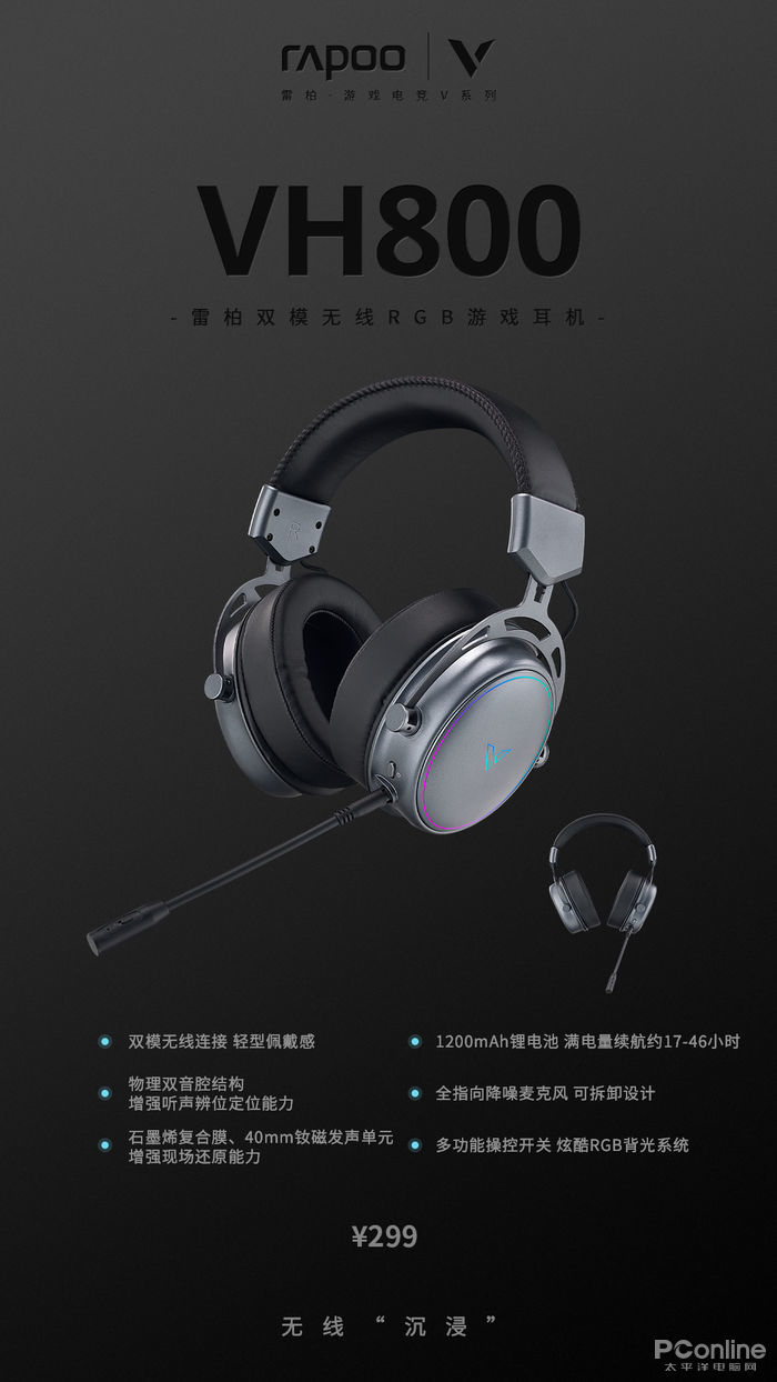 双模无线连接、物理双音腔结构、石墨烯材质复合膜、可拆卸麦克风设计、多功能耳壳操控。雷柏VH800双模无线RGB游戏耳机,在听声中,辩位准确。