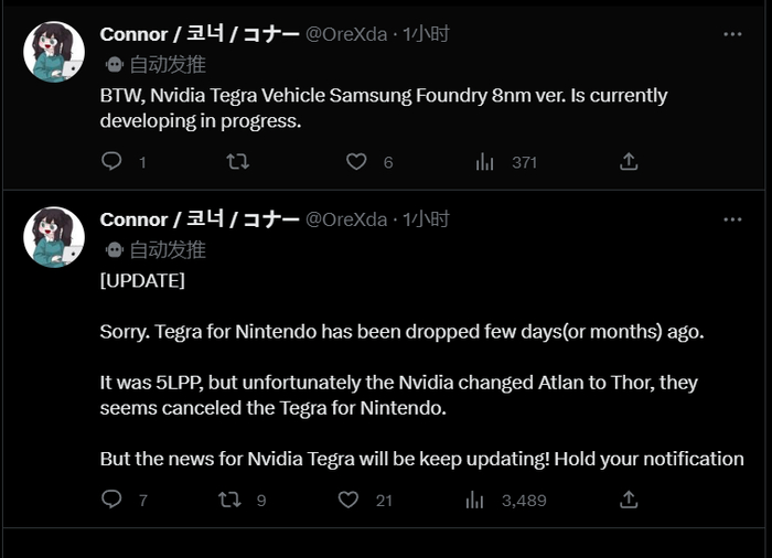 他后续更新称,原计划用于任天堂的 Tegra 芯片已在几天(或几个月)前被放弃,英伟达后续将该系列切换到基于 8nm 的车用芯片平台上,由 Atlan 改为 Thor。