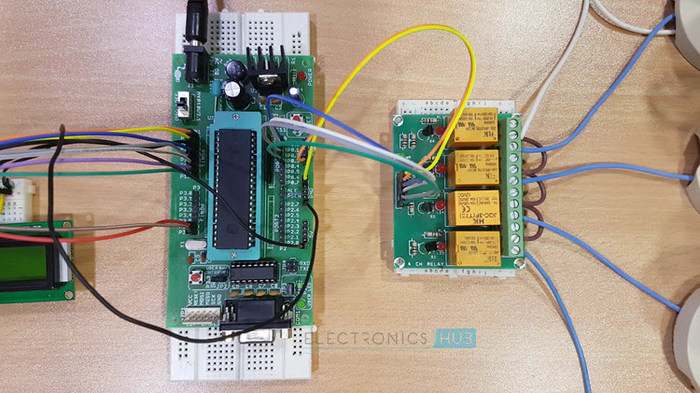 电气负载(如灯和直流电动机)通过4通道继电器模块连接到P0.0至P0.3针脚。在这里,继电器被用来使用小的直流电压来切换交流负载。NPN晶体管被用来驱动继电器。