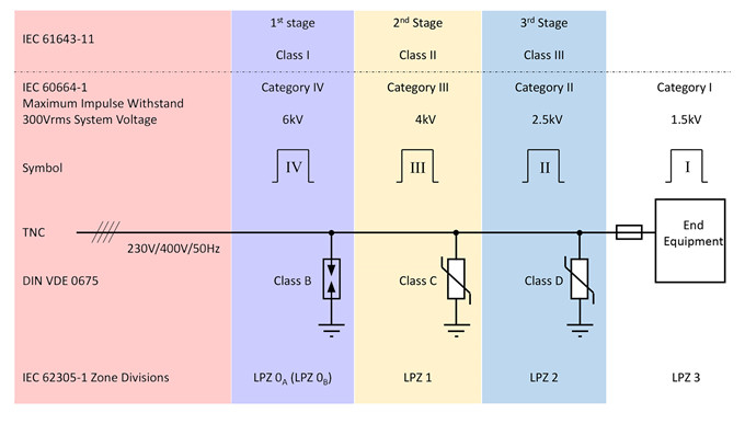 从建筑物的输入到配电系统的末端设备,浪涌保护装置 (SPD) 如图 2 所示(Class B、C 和 D ),它们可以消耗/吸收浪涌的脉冲能量。未标注的Class A SPD是低压配电系统的一部分,Class B 的特征是10/350µs 电流波形,通常使用气体放电管。Class C SPD 的特征是 8/20µs 电流波形,而Class D的特征是 1.2/50µs 电压波形和 8/20µs 电流波形的组合。Class C 和 D通常是使用金属氧化物压敏电阻 (MOV),在Class D前面总会有一个Class C。MOV 的使用寿命有限,钳位电压会随着每次浪涌冲击降低直到接近正常的工作电压,而且漏电流会持续增加直到过热出现故障。由于这个原因, SPD所用的 MOV 通常采用 DIN 导轨格式,这样可以直观看到它的健康状态。