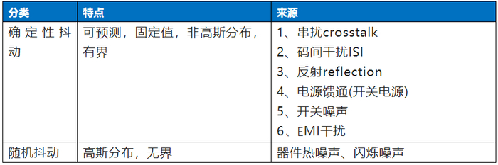 主要由电源或相邻信道的串扰等引起的,可以是周期的(Periodic),也可以是非周期的(non-periodic)。其来源通常有3种:电源噪声、串扰和外部噪声。