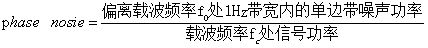 相位噪声(Phase Noise)是抖动在频域上的表现,通常定义为在某一频率偏移f0处1Hz宽带内的单边噪声信号积分功率和信号功率比值,单位是dBc/Hz,通常表示为dBc/Hz@ f0,数学表示如下: