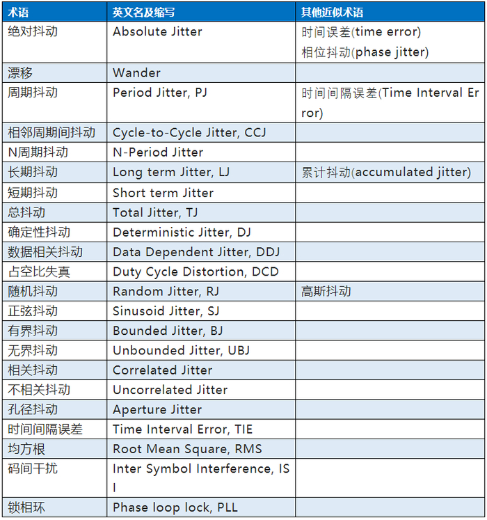 抖动分确定性抖动(Deterministic jitter,DJ)和随机性抖动(Random jitter,RJ)两种。DJ通常幅度有限,以单位时间表示,可粗略地分为周期性抖动(PJ)、有界不相关抖动BUJ和数据相关的抖动DDJ;RJ为高斯分布,以RMS均方根值表示。