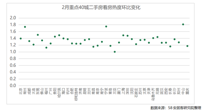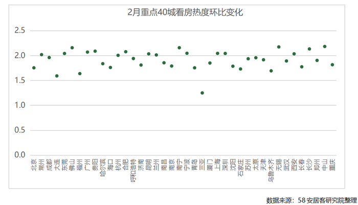 除三亚继续延续1月份的热度之外,多数城市新房找房热度环比普遍明显增加,将近半数的城市热度增长超过100%。不同于1月份的城市间的分化,2月份40个重点城市新房市场均呈现向好的趋势。