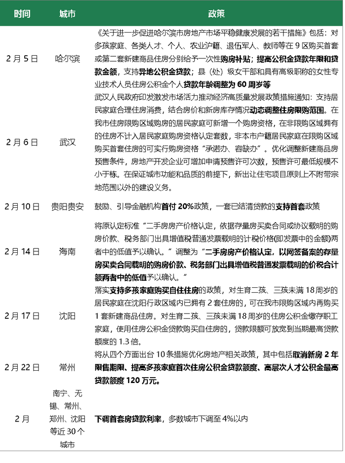 2月,楼市利好政策持续发布。中央层面,《求是》发表《当前经济工作的几个重大问题》的文章,文章指出要合理增加消费信贷,支持住房改善等消费;要因城施策,着力改善预期,扩大有效需求,支持刚性和改善性住房需求,支持落实生育政策和人才政策。地方层面,各地持续落实因城施策,优化限购限售、放松公积金贷款、发放购房补贴等支持性政策继续出台。