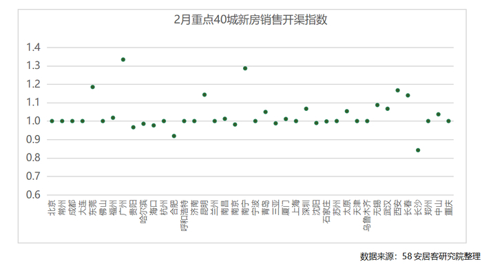 2月份,将近40%的城市房地产项目开通渠道的比例有所上升,40%城市渠道比例保持不变,渠道比例下降的城市,部分是由于供应项目的减少,部分是由于市场热度高,对于渠道的依赖度下降。整体来看,重点40城新房市场房产经纪业务经营情况向好。