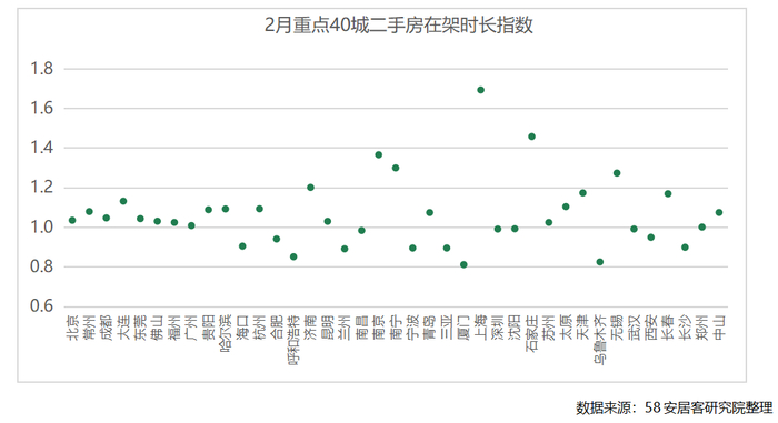40个重点城市中,60%的城市二手房挂牌周期缩短,上海和石家庄变化最大。上海二手房市场复苏明显,2月份新房新增供应较少,正好对应上海2022年八批次新房的尾盘和2023年首批新房认购的过渡期,一些业主为了置换“打新”,由于要赶新房供应周期,价格也比较好谈,成交周期明显缩短。