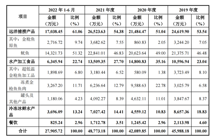 而金枪鱼正是大洋世家的核心产品。招股书显示,公司主要产品为远洋捕捞产品,含超低温金枪鱼原鱼、围网金枪鱼原鱼、鱿鱼,以及衍生加工品冻煮金枪鱼鱼肉。