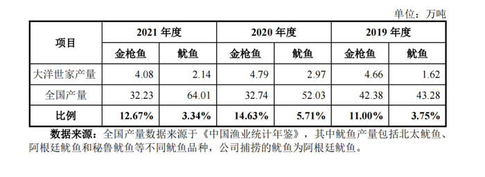 数据显示,2019年至2021年,大洋世家金枪鱼的产量分别是4.66万吨、4.79万吨以及4.08万吨,占全国产量的11%、14.63%以及12.67%。其中加工品冻煮金枪鱼肉的销量分别约为2.33万吨、2.36万吨、2.53万吨,产销率在报告期内达到了89.44%、103.47、101.40%。