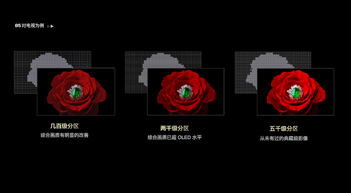 如果对液晶电视成像原理比较清楚的朋友一定知道,传统的液晶电视因为无法分区控制背光的亮暗,使得其在显示黑场效果时没有办法真正暗下去,很容易出现光晕问题,这就催生了Mini LED显示技术,该技术将背光模组进行分区,能够更有效地降低画面光晕,让整个电视画面表现得更为通透自然。