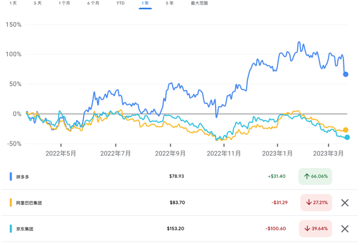拼多多、阿里、京东近一年的股价对比图 数据来源|Google 财经