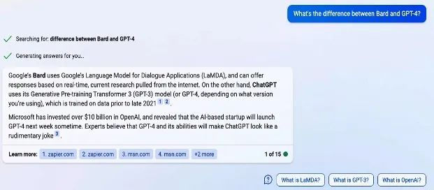 但New Bing目前能够给AI生成答案提供信息来源,以及基于生成答案自动提供拓展问题的功能目前Bard还并不具备。这或许也将在一定程度上影响Bard的信息产出的可信度,以及给搜索信息场景扩展带来局限。