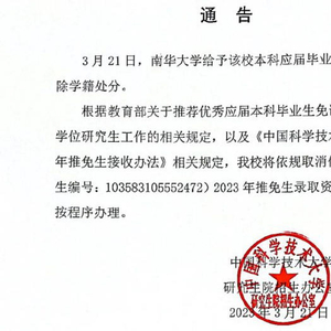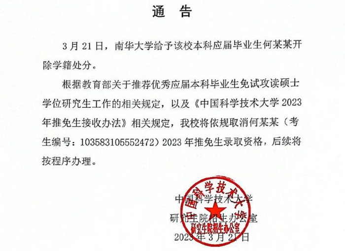 造“黄谣”的新闻,这一阵格外多。一向被视为象牙塔的大学,每每被牵扯其中,不免让人尴尬。继3月21日南华大学给予该校本科应届毕业生何某某开除学籍处分之后,今天,中国科学技术大学也发布通告,决定取消何某某2023年推免生录取资格。