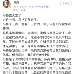 在这篇文章后,读者们留言表示,“去年无意中在马原的微博里看到他发布的‘马格离去’的消息,我惊诧万分。那么一个活生生的13岁的生命怎么就走了呢?今天在这篇文章里得到了答案。”“是浪漫的文人,也是愚昧的老人。”