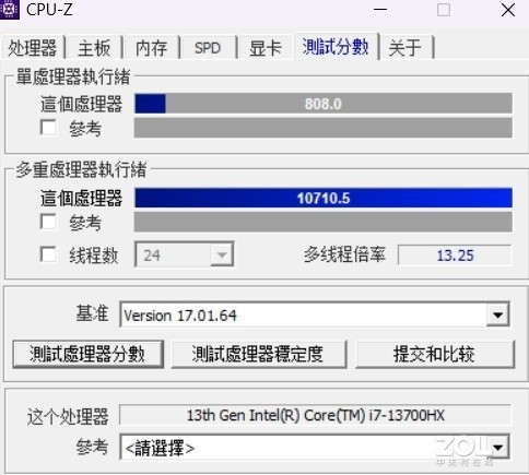 CPU-Z测试标准下,我们可以直观了解这颗处理器的单核和多核性能,其中单核得分808,多核得分10710.5。从测试结果可以看到,这颗处理器的单核和多核性能都得到了非常不错的发挥。