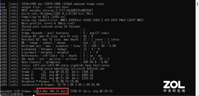 X265 Benchmark下,编码1128 frames 1080P视频耗时仅13秒,帧率达到86.74fps,H.265编码效率同样是大幅提升。