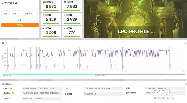 3DMark CPU Profile通过物理特效渲染来评估CPU的单线程和多线程性能,在其测试标准下,酷睿i7-13700HX单线程得分774,2线程得分1508,4线程得分2939,8线程得分5129,16线程得分7883,最大线程得分8871,总体性能表现出色。