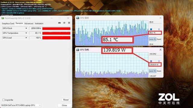Furmark的GPU单烤机测试,2.5K分辨率下,GPU功耗释放139.819W,也就是满功耗140W释放,同时可以看到,此时GPU温度控制在了85.1℃,GPU功耗与散热表现俱佳。