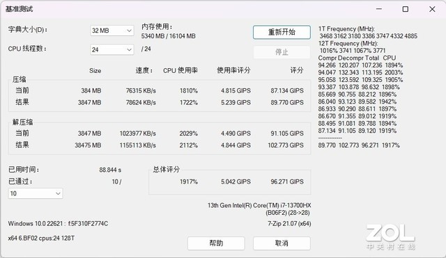 参考7-Zip基准测试,完成10轮压缩解压缩测试耗时为88.844秒,总体评分96.271GIPS,压缩速度达到78624KB/s,解压缩速度达到1155113KB/s。
