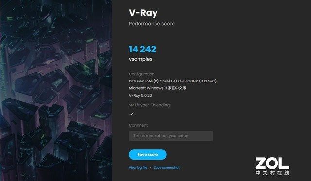 图像渲染能力方面,首先我们参考V-Ray Benchmark的测试。纯物理CPU渲染采样数量高达14242 vsamples,图像渲染能力相当不错。