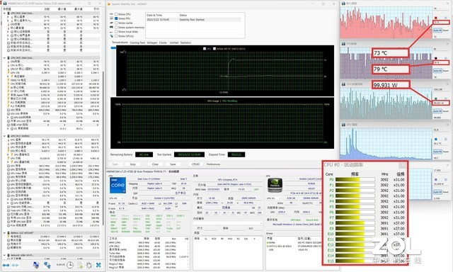 首先在AIDA 64 Stress FPU压力测试下,处理器核心温度被控制在73℃左右,封装温度也只有79℃,功耗稳定在99.931W,单烤功耗释放稳定,散热是目前所有测试的13代酷睿游戏本新品中表现最好的。