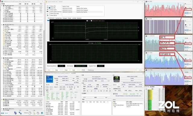 CPU+GPU双烤机测试下,处理器核心温度只有68℃,封装温度也只有70℃,核心频率稳定在2.4GHz。此时其GPU温度为86.5℃,CPU+GPU功耗释放达到34.714W+137.805W,整体表现不错,CPU与GPU功耗释放充分,且散热表现非常出色。