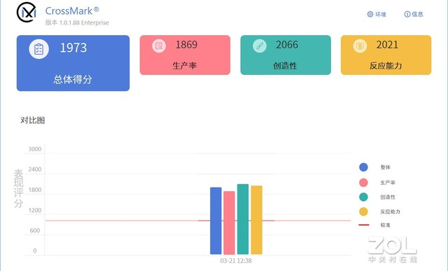 首先在CrossMark生产力性能测试中,其综合得分达到1973分,生产力单项得分1869分,创造力得分2066分,响应能力得分2021分,各项得分比较均衡,没有明显短板,在Office办公、图片处理等方面有着不错的效率。