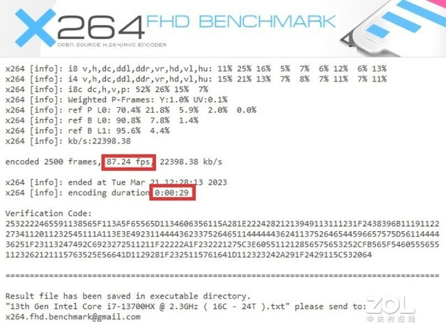 视频编码性能方面,我们使用X264 FHD Benchmark以及X265 FHD Benchmark进行了测试。X264 Benchmark下,编码2500 frames 1080P视频耗时仅29秒,帧率达到87.24fps。不得不说英特尔13代酷睿的H.264编码效率提升还是比较大的。