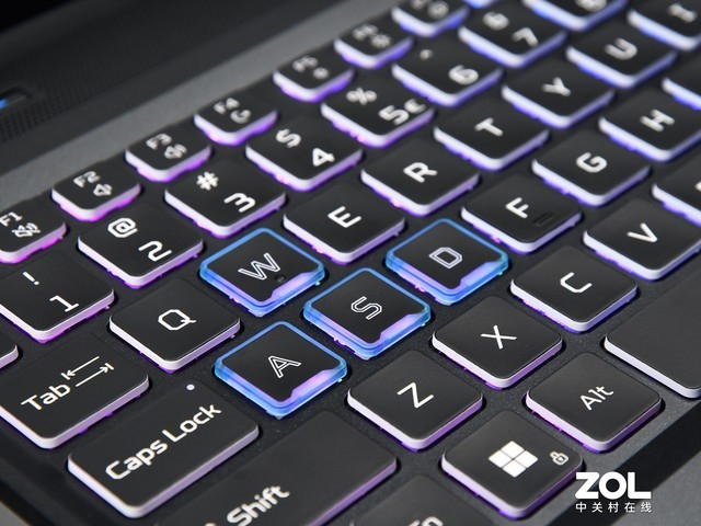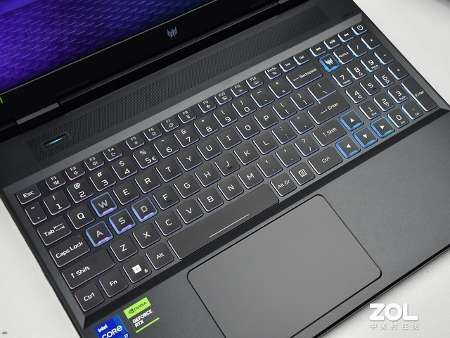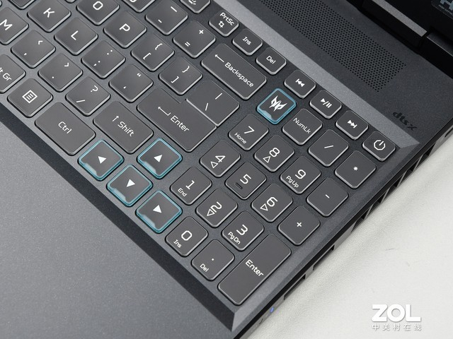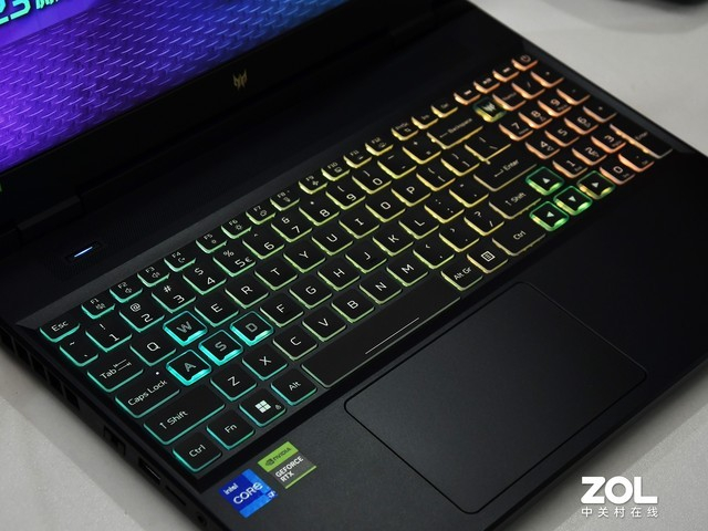 除了A面的设计理念有进一步提升外,在掠夺者 · 擎Neo的C面键盘使用上,宏碁也做了进一步的提升。该款笔记本搭载了四分区的RGB键盘设计,玩家可以通过PredatorSense控制感应系统对键盘的背光进行调节,各种色彩均可调,增加了战场的氛围。此外,WASD游戏常用按键进行了边框加粗设计,更加醒目。全尺寸的方向键和小键盘的设计,也令玩游戏的时候更加精准,可调快捷键操作更加方便。