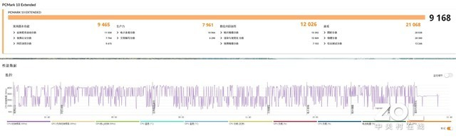 PCMark 10扩展模式测试中,其在常用基本功能,包含Web浏览、视频会议、应用程序启动等得分为9465分,说明其完成这些基础办公任务没有任何问题;而在生产力项目测试中得分为7961分,表明其拥有高效的电子表格、文档工作性能;数位内容创作方面,其评分高达12026分,说明其能够非常高效地完成图片、视频、图形渲染等工作;游戏性能方面的评分更是高达21068分,综合得分为9168分,是一款各方面实力都不错的全能产品。