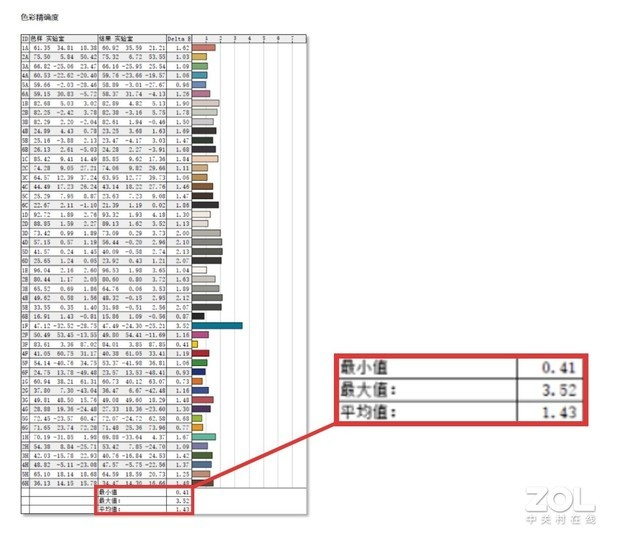 色准表现上,掠夺者 · 擎Neo屏幕平均ΔE为1.43,最小值为0.41,最大值为3.52,色彩还原偏离度低,色彩显示准确。