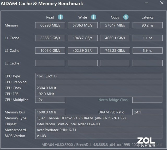 掠夺者 · 擎Neo的存储性能也是相当不错,这是其系统和游戏流畅运行的根基。它搭载了2×8GB DDR5内存,通过AIDA 64实测,其内存读取速度达到66298MB/s,写入速度57363MB/s,拷贝速度57847MB/s,延迟降低到了90.2ns,整体表现非常不错,尤其是在延迟方面控制到了一个非常好的水平。