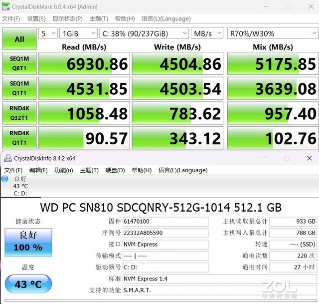 硬盘方面,这款产品搭载了一块西数512GB PCIe 4.0固态硬盘,实测其Q8T1顺序读取速度6930.86MB/s,写入速度4504.86MB/s,4K Q1T1随机读取速度为90.57MB/s,写入速度为343.12MB/s。达到了PCIe4.0固态硬盘的中高端水准。