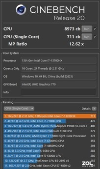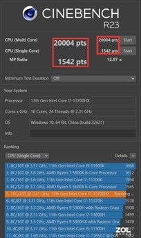 CINEBENCH测试标准下,CINEBENCH R15多核3604cb、单核273cb;CINEBENCH R20多核8973cb、单核711cb;CINEBENCH R23多核20004pts、单核1542pts。从CINEBENCH各项评分也可以看出,酷睿i7-13700HX在多核性能表现上非常出色。