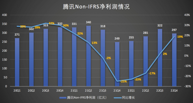 2022 年 Q4,腾讯降本增效有了一定的成效,营收同比增长 1% 至 1449.54 亿元,净利润同比增长 12% 至 1062.68 亿元,非国际财务报告准则净利润 297.11 亿元,同比增长 19%。