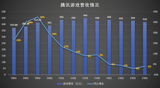 第四季度,腾讯游戏业务总营收 418 亿元,同比下滑 2.3%,这已经是腾讯游戏连续三个季度同比负增长。