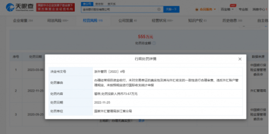 天眼查显示,因”办理经常项目资金收付,未对交易单证的真实性及其与外汇收支的一致性进行合理审查、违反外汇账户管理规定、未按照规定进行国际收支统计申报“的违法违规事实,该行被警告,处罚没款人民币73.67万元。