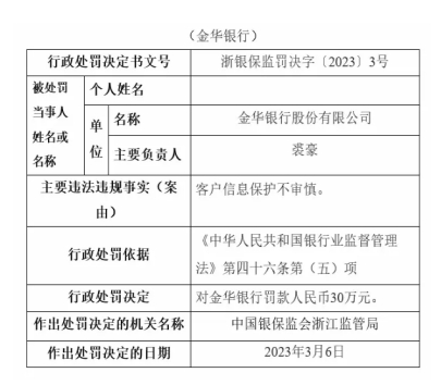 2023年3月10日,银保监会发布的行政处罚信息显示,依据《中华人民共和国银行业监督管理法》第四十六条第(五)项,金华银行因“客户信息保护不审慎”被浙江监管局处以罚款30万元。
