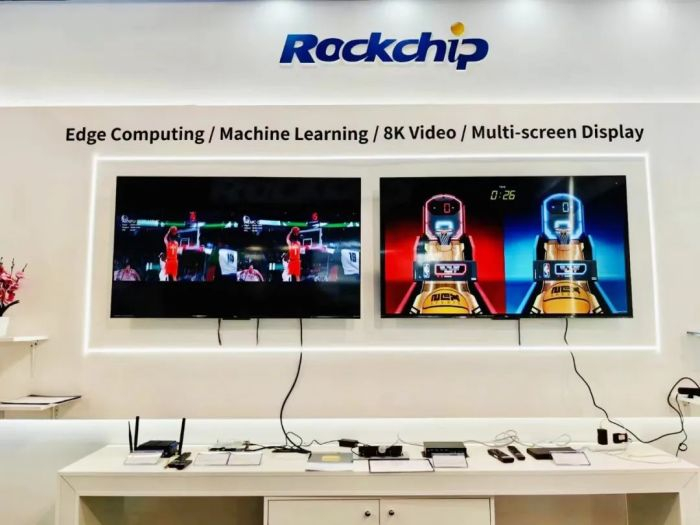 RK3588展区,展出了各类RK3588应用的成果,包括SOM、SBC、8K大屏应用、工业平板、边缘计算应用等。在8K显示技术方面,展示了基于RK3588的IBC游戏盒子,超高清画面,游戏运行流畅稳定;多屏异显能力方面,展示了3个4K 30Hz输出加1个1080P 60Hz输出,适用于车载、商显、智能交通等场景