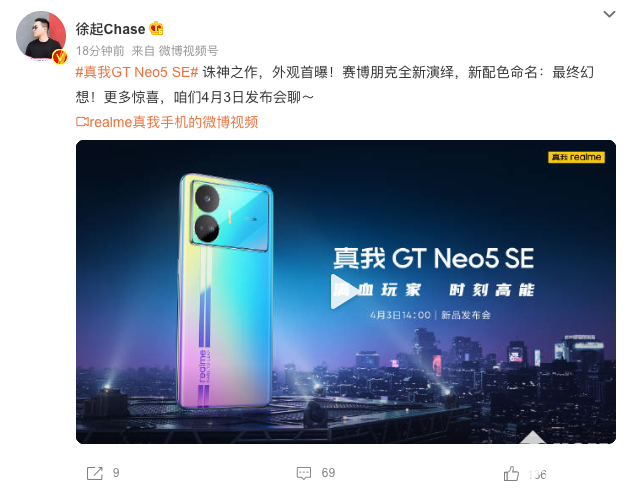 2023年3月23日,realme官方发布消息称,真我GT Neo5 SE将于2023年4月3日14点正式发布,产品口号为“满血玩家,时刻高能”。真我realme副总裁、全球营销总裁、中国区总裁徐起爆料称,真我GT Neo5 SE新配色命名为最终幻想。